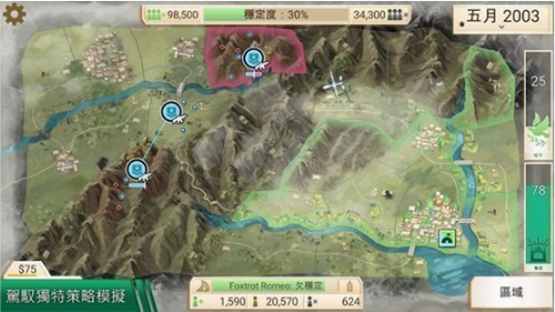 情报收集机制贯穿整个决策流程,区域代表可深入灰色地带获取关键信息。动态天气系统会影响部队行动效率,雨季道路泥泞将延缓物资运输。叛乱势力会随游戏进程进化战术,后期可能出现跨境流窜作战等复杂情况。