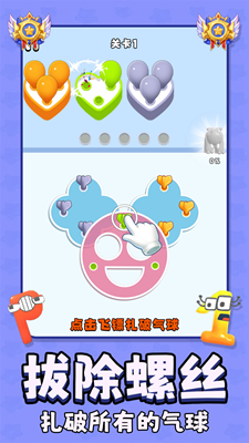 螺丝高高手趣味机械解谜挑战是一款融合物理操作与策略思考的休闲手游,玩家需要通过精准操作拆解机械装置,运用智慧戳破对应颜色的气球完成闯关。游戏基于真实物理特性设计,每颗螺丝的旋转力度与角度都将影响最终效果,搭配多样化的道具系统,为玩家打造出沉浸感十足的机械解谜体验。