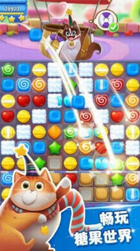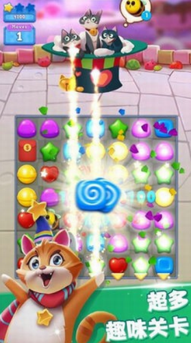 1. 动态粒子特效呈现缤纷糖果雨,每次消除伴随猫咪撒娇音效