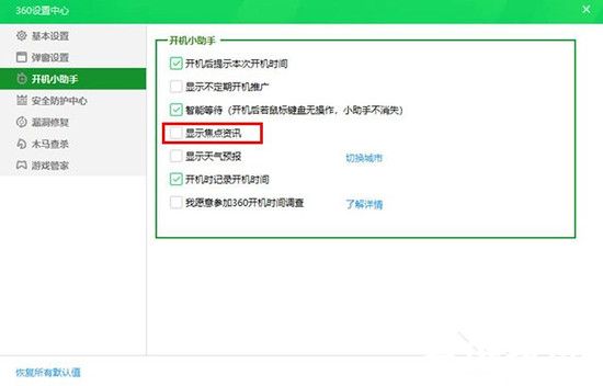 4、在安全中心控制台选择开机辅助功能项,取消勾选界面元素展示中的"显示重点资讯提醒"选项。建议同步取消"展示不定期开机推荐"等相关推广类目。
