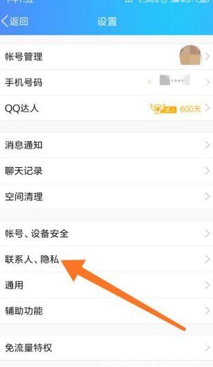 3、在参数设置目录中,着重选择"联系人、隐私"分类选项,该模块集成多项社交权限管理功能。