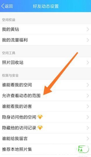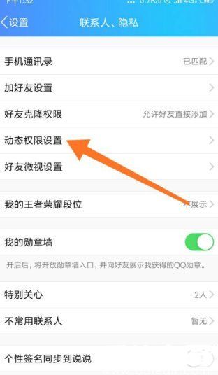 4、进入隐私管理面板后,向下滚动可见"动态权限设置"入口,此处集中管理空间动态的可见性规则。