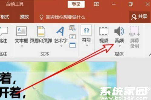2、在多媒体功能组中点击「音频」控件,此时将展开包含多种音频源的下拉菜单。需特别注意不同版本office的界面差异,2016版提供「PC端音频文件」的明确选项。