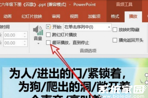 5、切换至「音频工具-播放」专业设置面板,此处集中了音频播放的核心参数配置。重点勾选「循环播放」与「跨幻灯片播放」双选项,前者确保单页循环,后者实现跨页持续。