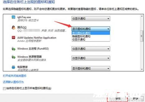 3. 在应用程序列表中找到QQ条目,将状态切换为「显示图标和通知」,确认修改后点击右下角保存设置。