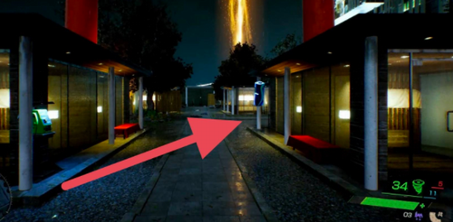3. 穿过布满自动贩卖机的街道后,注意左侧建筑的钢结构外廊。攀爬至二层平台,沿着生锈的金属围栏移动至东南角,此处可发现向下延伸的遮雨棚结构。