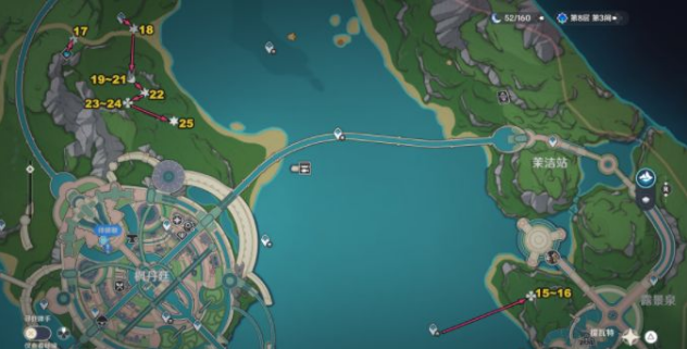 2、具体分布采用三级标记体系:六角星标识单株生长点(3个),四叶草代表双生植株(6个),鸡腿符号标注密集生长区(9个)。建议按逆时针路线沿枫丹廷外围展开地毯式搜索,可最大限度提升采集效率。