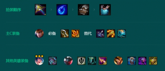 核心输出奎因必备无尽之刃,次选光明杀人剑或破防者,建议优先追三星提升爆发能力。副C位铁男推荐德玛转职与水银组合,搭配纳什之牙强化持续输出,需注意避免选择火炮影响技能衔接效率。主坦皇子装备以冰霜之心与适应性头盔为核心,光明狂徒可显著提升承伤能力。