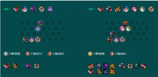 开局获取德玛转职后,建议以5德玛体系过渡,优先搭配天使与琴女组成羁绊。前排可使用两星卡萨丁携带转职装备过渡,若无奎因可用莎米拉临时担任输出位。中期需在6人口阶段完成核心卡质量提升,后期根据局势选择速8找高费外援或追三星关键卡。