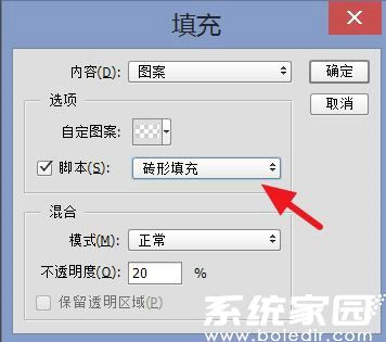 4、在自定图案库末端选择最新创建的预设图案,此时画布将出现基础平铺效果。关键步骤在于点击脚本下拉菜单,选择【砖型填充】算法
