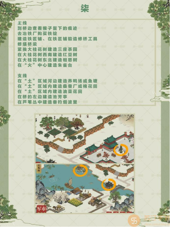 场景西侧的古道区域需特别注意视角调整,向左滑动屏幕可发现隐藏庭院。建筑摆放需严格遵循系统指引,参考以下坐标进行定位: