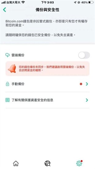 5、通过底部导航栏进入"系统设置"菜单,选择"安全备份"选项进行账户保护设置。