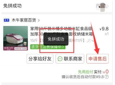 4、成功开启免拼服务后,请立即点击订单详情页的「申请售后」功能入口