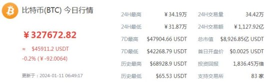 截至2024年1月11日统计,比特币单价维持在45,823.84美元区间