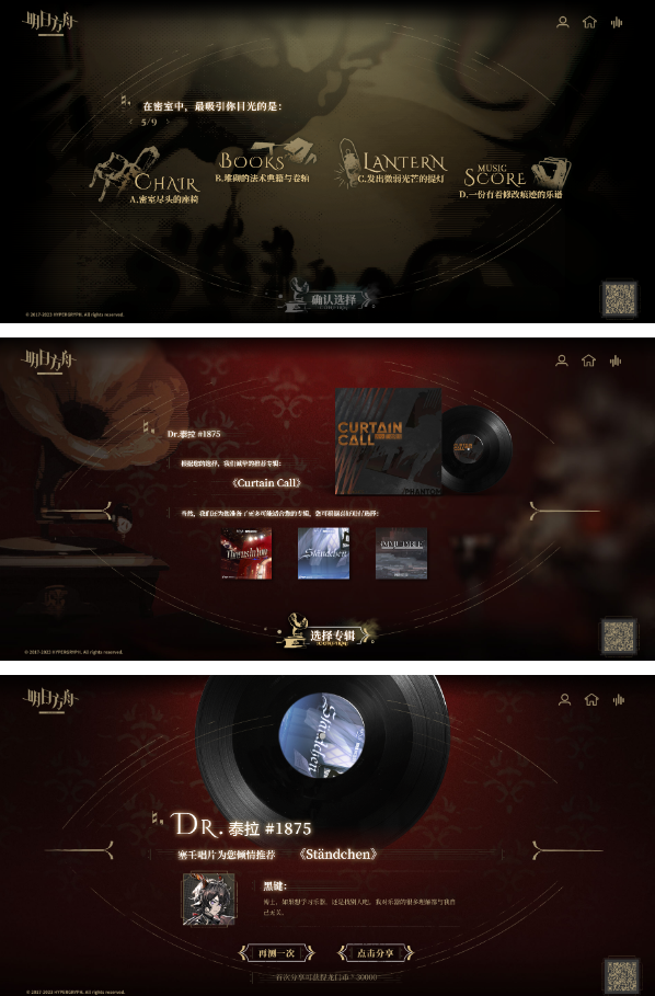 活动采用音乐心理测试的创新形式,通过七组动态选项组合生成个性化音轨。每次选择将影响最终生成的BGM风格,建议根据个人偏好进行真实选择。系统会根据玩家决策路径生成专属音乐卡片,可保存至本地相册。