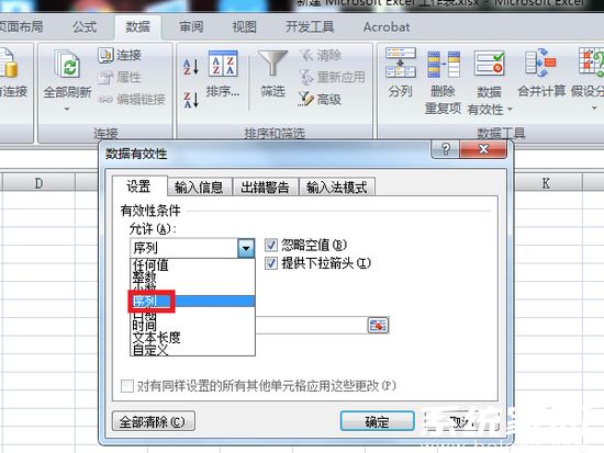 3. 在参数设置对话框的「验证条件」区域,将允许条件更改为「序列」类型。此设置可将单元格转换为下拉选择模式,为后续符号输入建立基础框架。