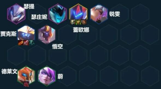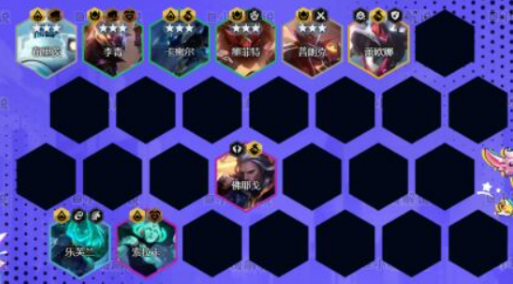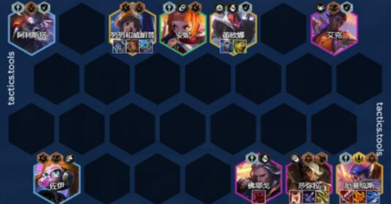 高费卡为核心的后期阵容,迪迦与努努组成双核输出。运营关键在于前期经济管理,利用灵能使羁绊过渡,速九人口搜取五费卡完成最终成型。