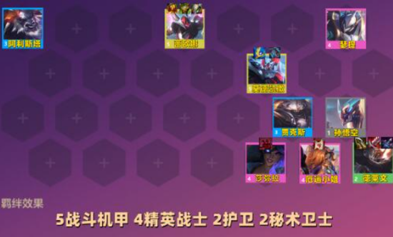 5战斗机甲提供高额属性加成,德莱文携带最后的轻语与无尽之刃破除前排。4精英战士羁绊对低血量单位造成斩杀效果,适合应对重装阵容。