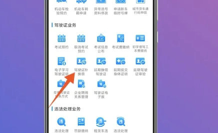 2、进入业务办理总览界面后,需向下滚动至"驾驶证业务"模块。该模块采用分类卡片式设计,选择带有驾驶证图标的"驾驶证补换领"选项,该功能支持包括期满换证在内的6项主要服务。